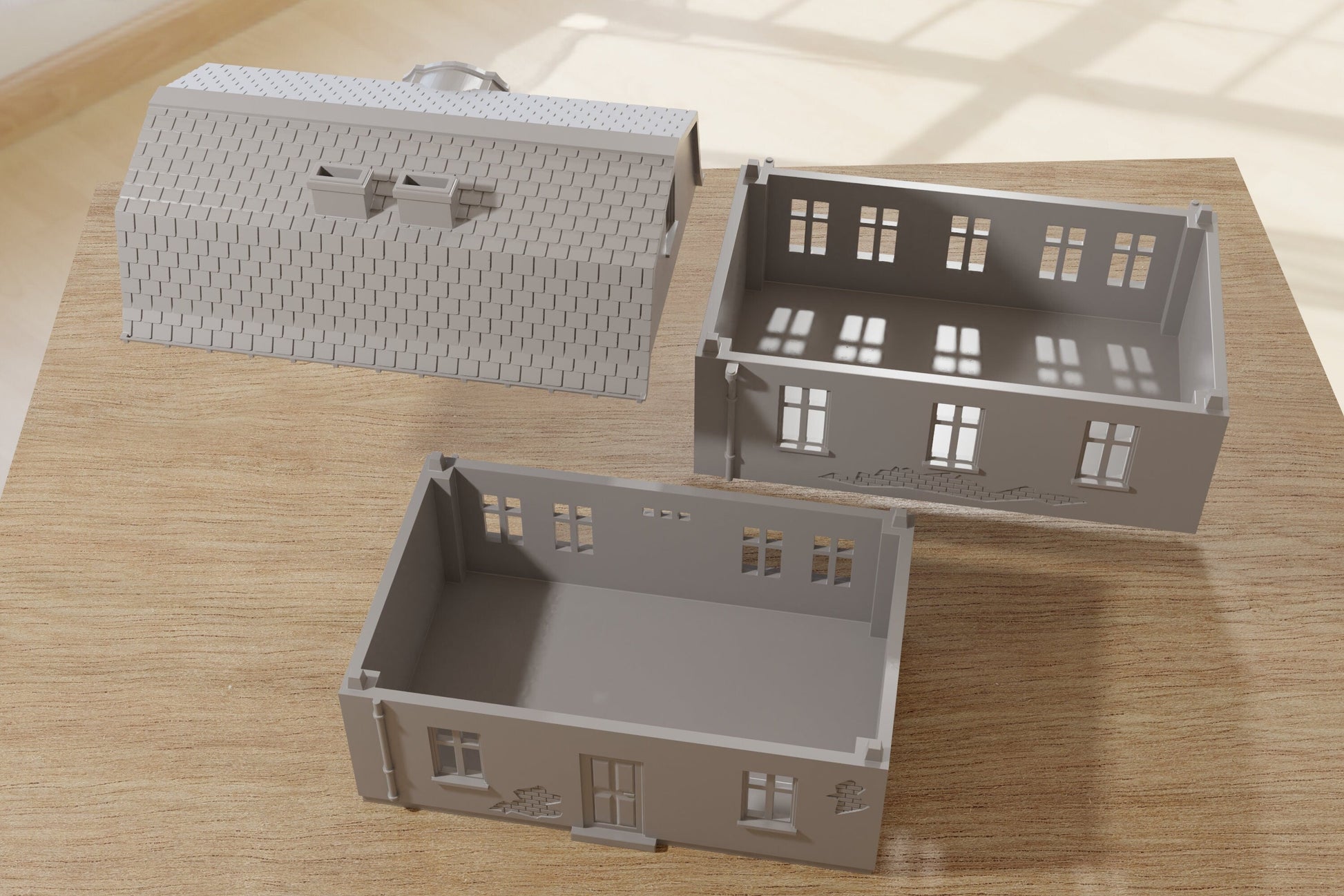 All buildings are unpainted and unprimed. I do the cleanup, but some tiny fibers may still be present. It may come in grey or black. Each building is created from stackable sections as shown in the images.